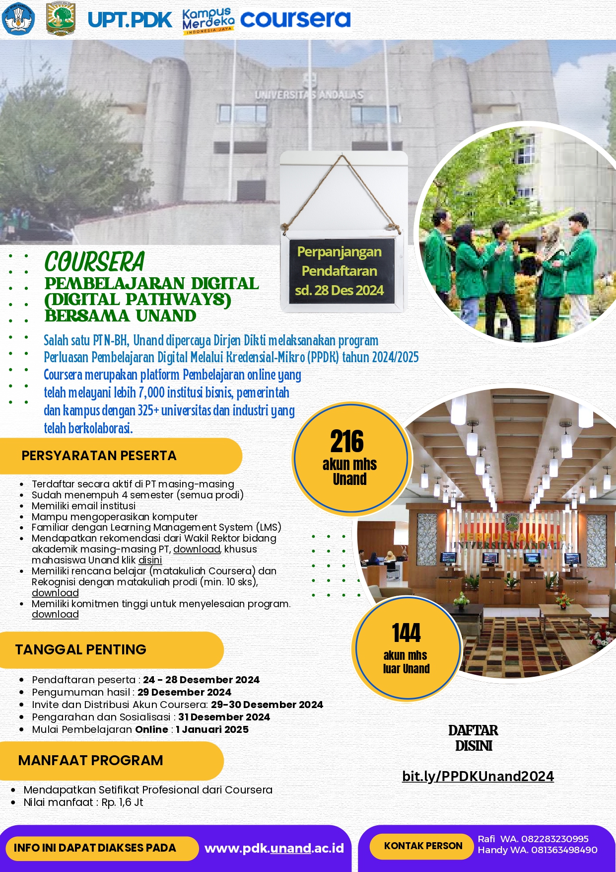 Unand sebagai salah satu PTN-BH yang dipercaya Dirjen Dikti Kemendikbud melaksanakan Perluasan Pembelajaran Digital Melalui Kredensial-Mikro (PPDK) tahun 2024-2025, memperoleh hibah berupa akun Cousera sebanyak (360 untuk mhs+25 untuk Dosen/Pegawai Unand). Akun ini akan didistribusikan kepada mahasiswa Unand sebanyak 216 mahasiswa (60%) dan 144 mahasiswa (40%) untuk mahasiswa diluar Unand.